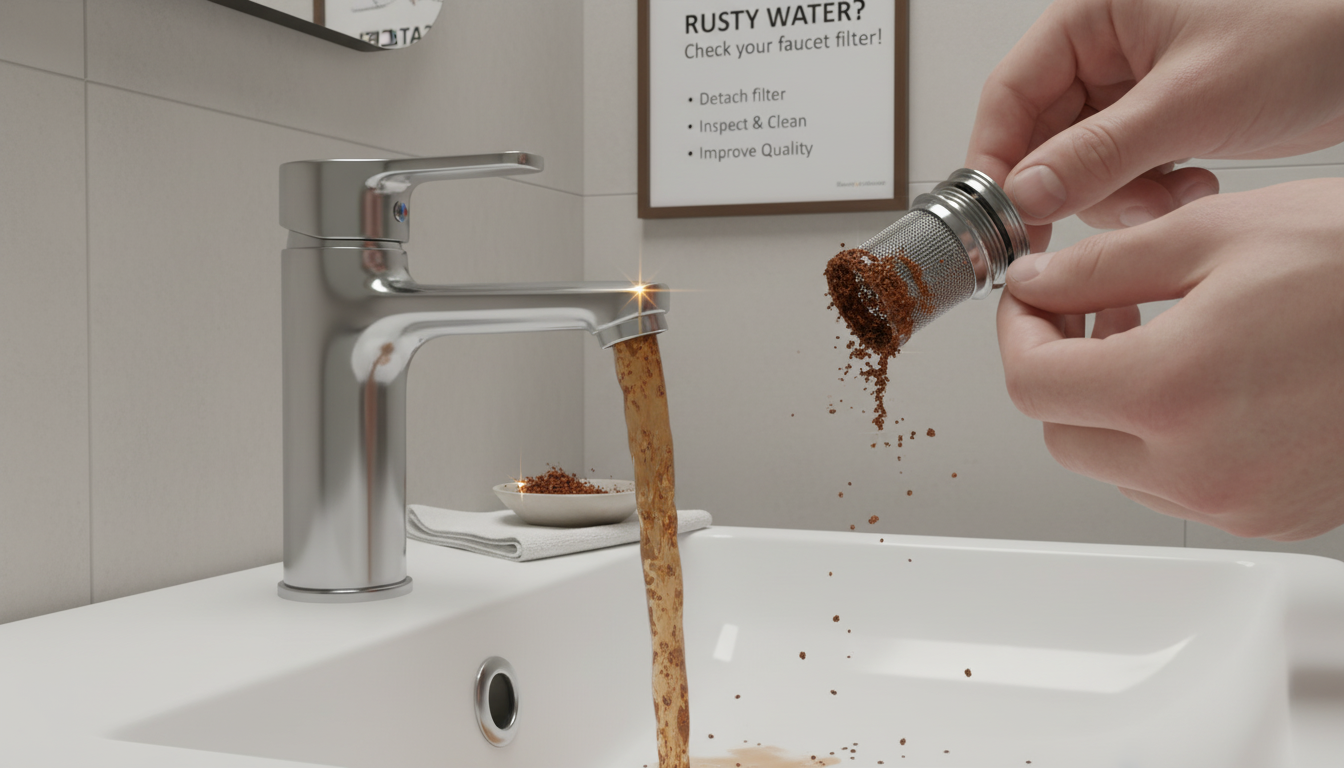 수도에서 녹물이 나올 때는 수도 꼭지 필터(에어레이터)에 녹이나 이물질이 쌓여 있을 가능성이 있습니다.