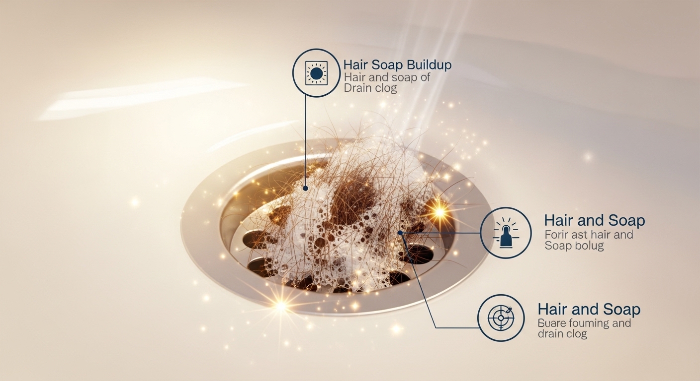 Hair, soap residue, and debris are the main causes of clogs.